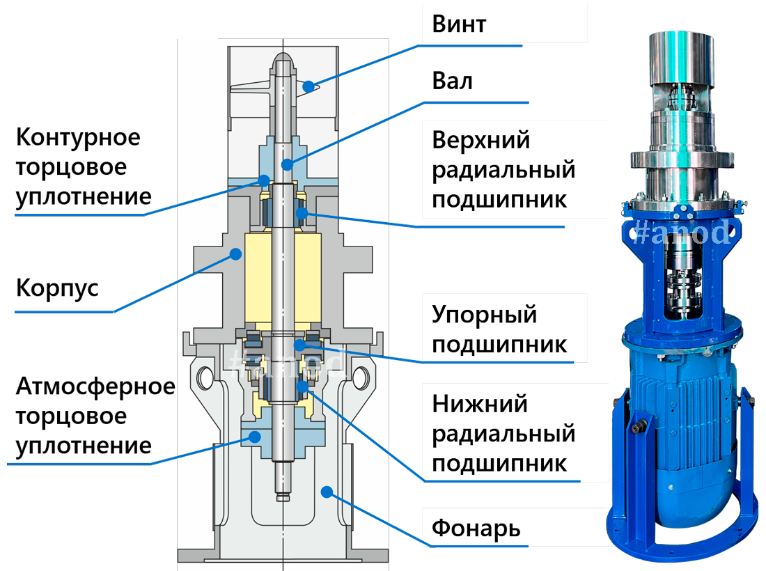 Штатный электропривод мешалки: герметичный (с мокрым ротором) предназначен для перемешивания химических веществ внутри реактора при помощи трехлопастного винта. Состоит из герметичного электродвигателя, вала, винта, торцового уплотнения, радиальных и упорных подшипников скольжения.